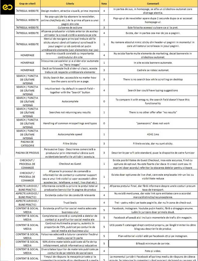 - Website-urile magazinelor online sunt evaluate de 30 de experți în E-Commerce și Digital Marketing prin peste 200 de criterii esențiale care vizează: User Experience (ușurința folosirii website-ului de către utilizatori atât pe Mobile, cât și pe Desktop), Aspecte Esențiale de Marketing Online (optimizarea zonelor de promoții din site, Cross-Sell, Up-Sell, Product Bundles, programe de loializare etc.), Funcționalitățile Website-ului (verificarea tuturor formularelor și a procesului de checkout), Search (funcționarea corectă a căutării interne conform bunelor practici internaționale), SEO (indexarea în motoarele de căutare), Security (protecția site-ului, a bazelor de date și a informațiilor sensibile despre utilizatori), E-Mail Marketing (calitatea campaniilor de Newsletter), Content & Social Media (calitatea conținutului propriu și prezența în Social Media), Calitatea Serviciilor (se evaluează prin comenzi de Mystery Shopping), Aspecte Juridice (respectarea legislației în vigoare și a bunelor practici);